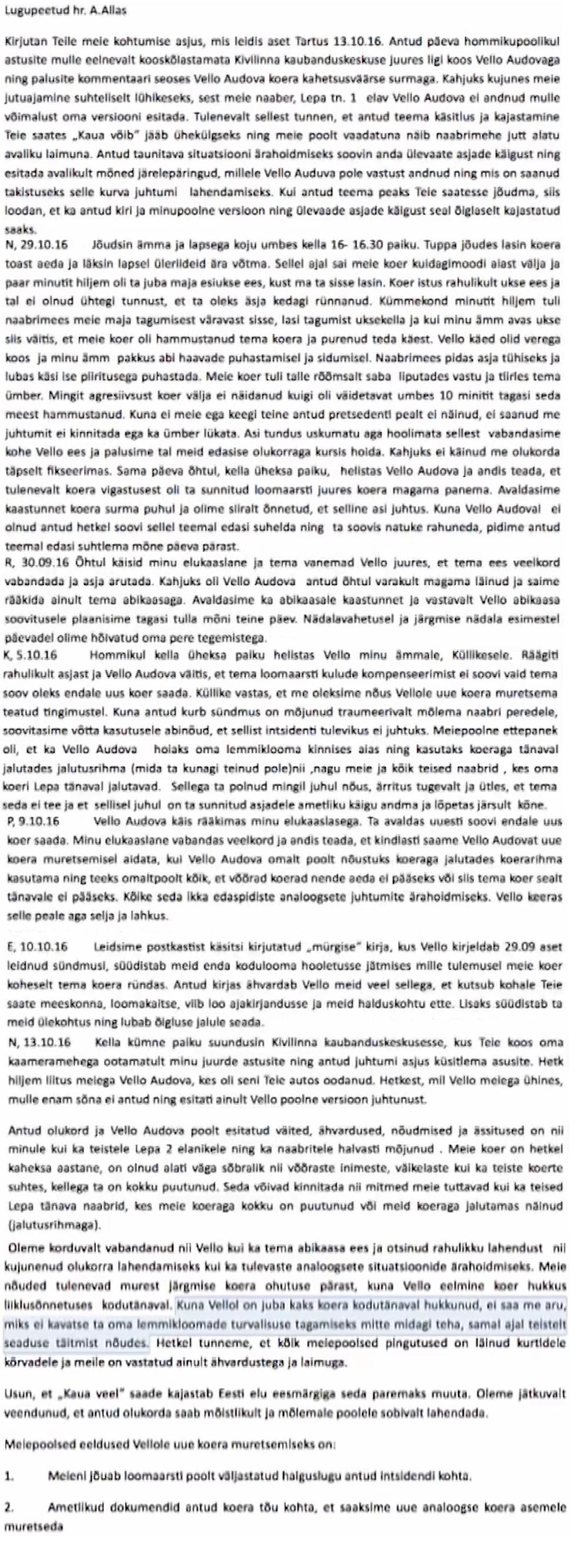 Nagu saadetud kirja järgi aru sain on tegemist väga korralike inimestega, kes alguses püüdsid leida mõlemat osapoolt rahuldava lahendusega/kokkuleppega. Väidetavalt aga ei soovinud Vello nende pakkumist (pakkumisi) vastu võtta. Siin on kohati selline pada sõimab katelt situatsioon, sest mõlemad ajavad oma joru. Üks soovib tagasi saada loomaarstile välja käidud raha ja uut koera asemele, samas teine pool raiub kindlalt vastu, et kannatanu peab uue analoogse koera saamisel tagama koera turvalisuse väljaspool koduhoovi ehk siis koer peab olema jalutusrihma otsas. Jah, olen sellega 100 prossa päri ja mitte kübetki vähem ja mitte ainult seepärast, et seadus seda nõuab (seadus nõuab lisaks jalurusrihmale vajadusel teiste inimeste (ja ilmselt ka loomade) ohutuse tagamiseks suukorvi kasutamist, mida väidetaval purejal tol päeval ei olnud), vaid ka seetõttu, et iga lemmikloom, olgu selleks koer või kass, kilpkonn või hamster või merisiga, minu pärast kas või okaapi, on elusolend. Nemad samuti hingavad ja vajavad juua-süüa. Nendel on süda ja nendel on tunded. Nii nagu igal inimesel, nii on ka igal loomal oma iseloom. Ka nemad soovivad tähelepanu ja armastust ja kindlasti peab neid ümbritsev keskkond olema turvaline ka neile. Rääkides ainult koertest, siis minu arvates on John Grogan peale Marley surma öelnud ilusa lause: “Koeral on ükskõik, kas oled tark või loll, rikas või vaene. Kingi koerale oma süda ja ta kingib sulle enda oma”. Onju õige, eksju?