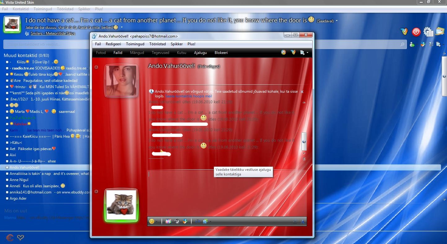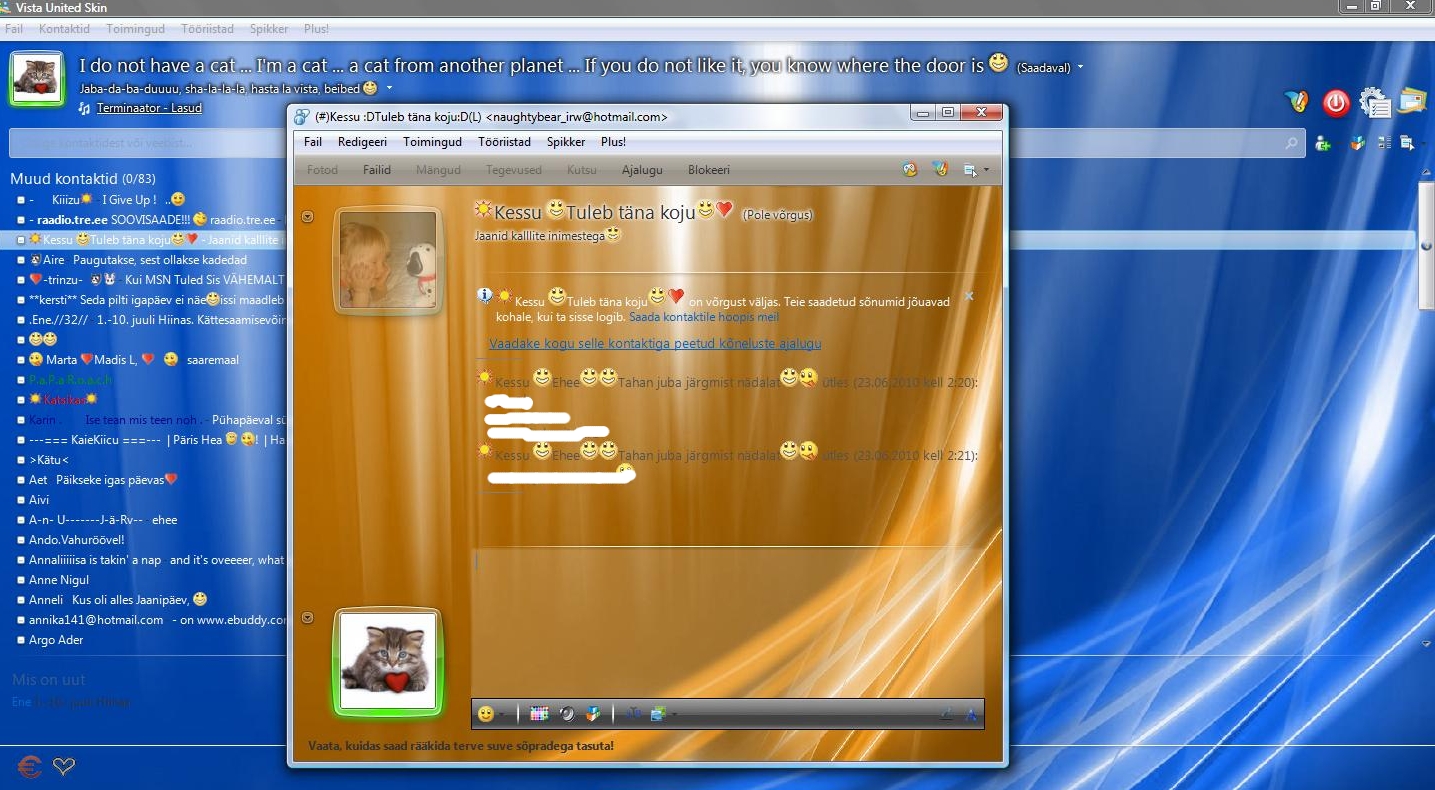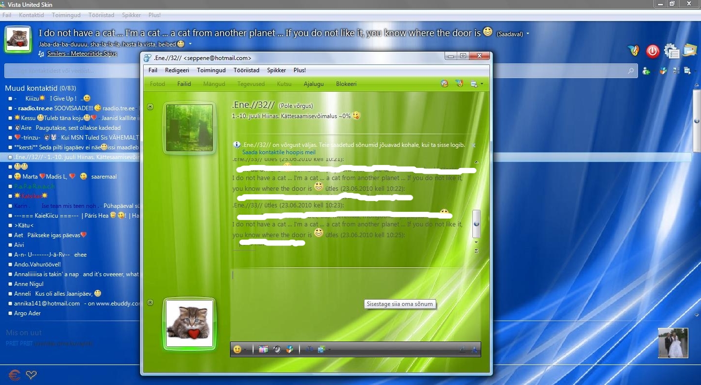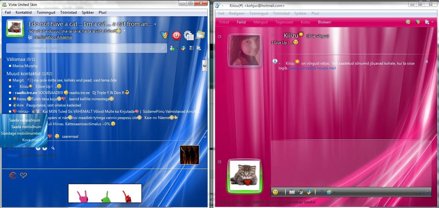 Mina, kes ma suhtlen MSNis nii mõningate inimestega, tuttavatega, sõpradega, otsustasin jagada teile tsips infi, kuidas muuta messengeri välimust huvitavamaks. Ehk isegi paljud teavad, on see lihtne. Aga siiski need, kes ei tea, lugege nüüd ja järgides neid juhiseid, saate muuta oma messengeri kasvõi selliseks nagu minul, mille screenshot on allpool. Kujunduse muutmine on tegelikult imelihtne ja selleks tuleb teha ääretult vähe. Seda saab aga teha järgmiselt: