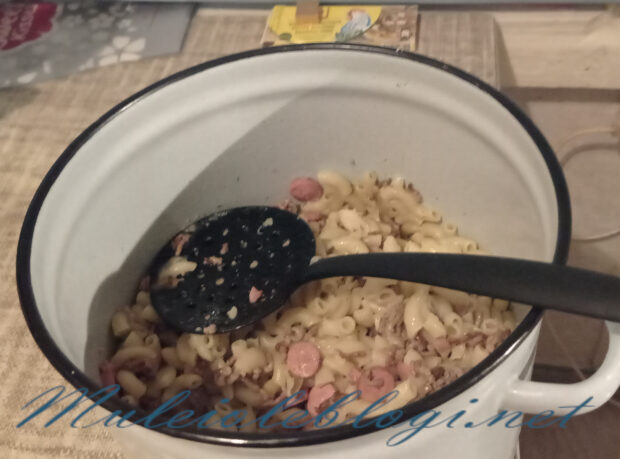 Siis tuleb kõige tähtsam osa – erinevate koostisosade praadimine. Esimeses etapis praadida pruunikale tasemele hakkliha, kasutades võimalikult vähe õli. Siis lisada juurde juustuvorsti tükid, sulatatud suitsujuustu tükid ning hot dogi vorstikeste tükid ja praadida läbi koos hakklihaga seni, kuni hakkliha (ja vorstid) on ilusad kuldpruunikad. Lõppfaasis raputada peale tilli, segada korraks komponendid omavahel laiali ning siis valada kokku pastaronidega. Ja kes on suur õlikasutamise fänn, siis pannile jäänud väike kogus õli samuti valada makaronidele. Kindlasti segada. Lisa üks puljongikuubik, näiteks kana, nagu tegin mina, ning segage uuesti. Ja ongi valmis!