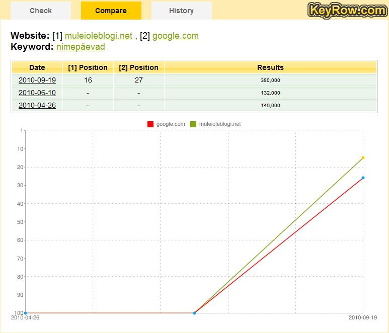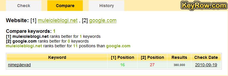 Nüüd, kus ahju tuli tehtud, saan lisatud ka uue sissekande, mille põhiteema sel korral oleks seotud interneti ja veebindusega. Nimelt leidsin lehekülje, mille aadressiks on www.keyrow.com ning kust saab otsida märksõnu, mis otsimisel leiab leheküljed, kus on seda enim leitud või nii. Ega ma päris hästi ei saagi aru, mida see lehekülg pakub. Aga see vist ei olegi tähtis, kuna avastasin, et mu veebipäevik – muleioleblogi.net on kataloogis esindatud nelja märksõnaga (aforisme, nimepäevad, luuletused, ee domeen) ja TOP 100-s on mu bloggeri kõige paremaks kohaks 16. koht märksõnaga nimepäevad, kusjuures Google.com on alles 27-ndal. Otsustasin teha veel ühe katse, mida lehekülg pakkus, tehes linnukese Google.com ja Muleioleblogi.net ette ning vajutades “Compare Websites” – tulemus tuli järgmine: