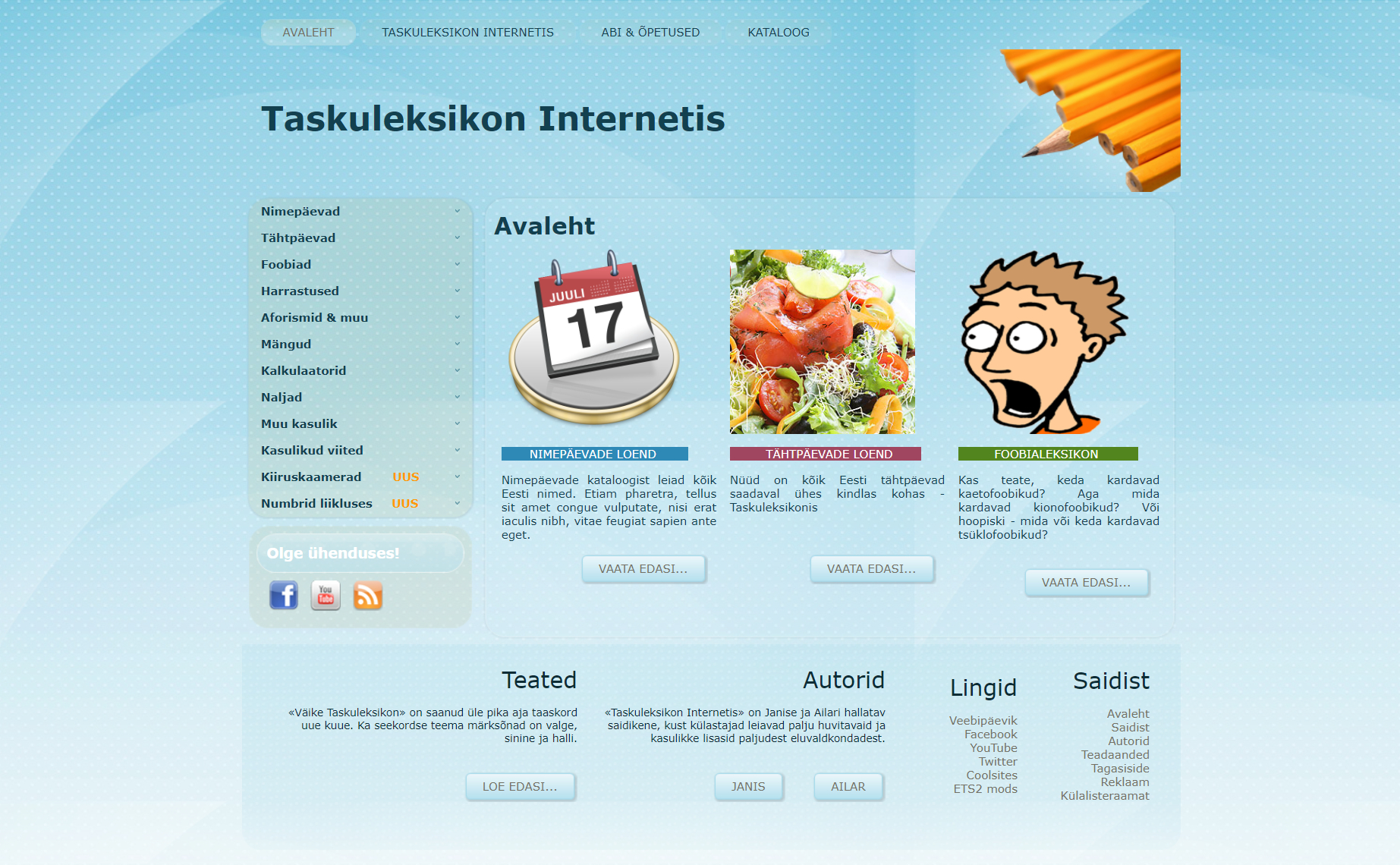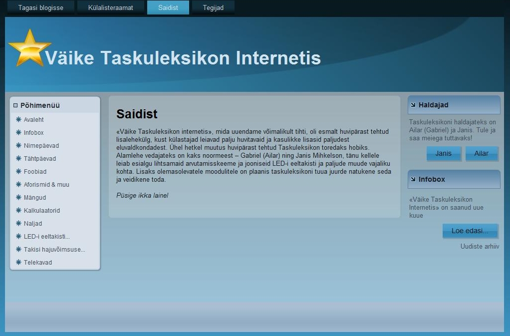 Tutvustus: Uue väljanägemise saanud “Väike taskuleksikon internetis”, mille uus kujundus läks veidi nihu, oli esmalt huvipärast tehtud lisalehekülg, kust külastajad leiavad palju huvitavaid ja kasulikke lisasid paljudest eluvaldkondadest. Ühel hetkel muutus taskuleksikon üheks mu peamiseks projektiks, mida haldan siiamaani ja mis uueneb väga tihti. Väikese taskuleksikoni vedajateks on kaks noormeest – Gabriel (Ailar) ning Janis Mihkelson, tänu kellele leiab esialgu lihtsamaid arvutamisskeeme ja jooniseid LED-i eelatkisti ja paljude muude vajaliku kohta.