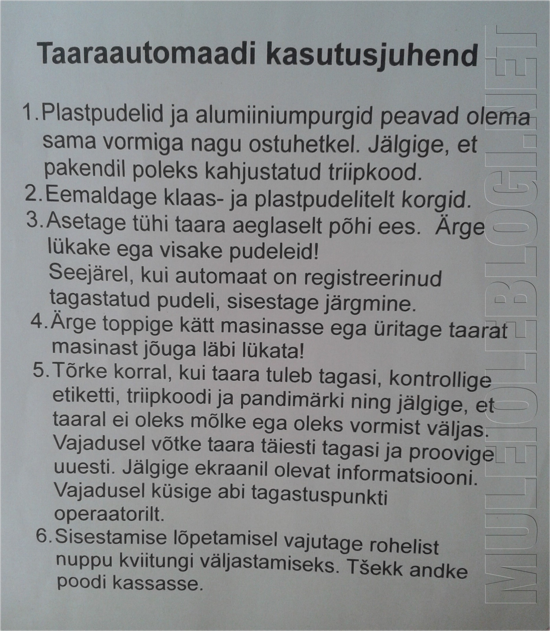 Esmalt hakkame pihta põhipunktist ehk taaraautomaadi kasutusjuhendist, mis igas taaramajas Saaremaal Kuressaares masina lähedusse lugemiseks ja teadmiseks ülesse on pandud: