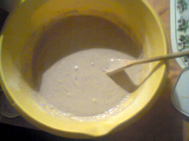 Ja siis alustasin: esmalt valasin kaussi pool pakki jahu, seejärel panin juurde 4 muna ja segasin korralikult ära. Siis sai juurde valatud vett, segades jahu ja munamassi veega kokku. Kui möks paras, ei olnud liialt paks ega vedel, selline paras, lisasin sekka veidi pruunijahu, millest tegin küpsiseid, soola ja suhkrut. Siis segasin jälle.