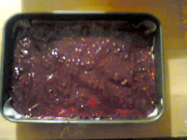 Seejärel sai peale pandud moos, mida olin eelnevalt Armsakese soovil seganud suhkruga. Moosi peale omakorda sai pandud ülejäänud tainas, mida kahjuks jäi veidi puudu.