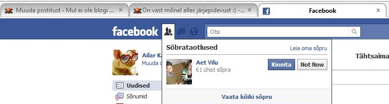 Asudes aga sissekande esimese teema juurde, siis mingi kevadest ehk, võib-olla ka suvest alates on Facebookis üks kasutaja – Aet Vilu, kes näib olevat üks kuradi sitke ja järjekindel naine. Esimesel korral otsustasin, et ei taha teda oma sõbralisti (mul ei ole muidugi midagi tema vastu), aga siiani ei ole ta alla andnud lootuses sellesse listi pääseda.