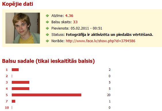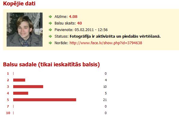 kommenteerija on taaskord isased, aga õnneks on ülejäänud kõik emased. Neist silmajäävamad kommentaarid oleksid kasutajatelt LiLy8, kes arvab, et näen välja veidi lollakas, millega ta sugugi mööda ei pane. Nõustun! Kasutaja BeAtEnS arvab, et pilt on positiivne, mida ta sellega siis ka ei mõtleks. Ning viimane kommenteerija, suns16 leiab, et pilt on kena. Kas mu tõlked Läti keelest eesti keelde ka paika peavad, täpselt, vähemalt kaudseltki täpsed on, ma ei tea.