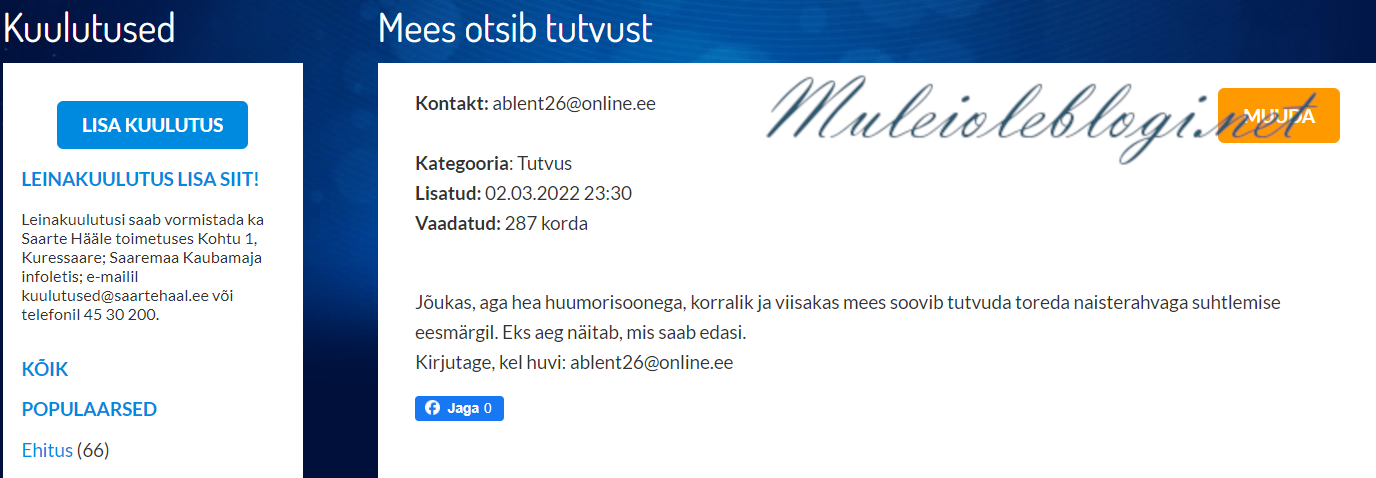 Nimelt oli muleioleblogi.net domeeni avamisel (domeeni registreerisin esmakordselt 2010.aasta juunis) üks mitmete esimeste postituste seas artikkel sellest, kuidas on minul naistega väga palju ebaõnne, sest keegi ei vasta kuulutustele, kuigi need on koostatud (peaaegu) korrektse grammatikaga, loodetavasti stiilipuhtad ja on välja toodud, keda ja miks otsin. Need on olnud minu meelest ilusad ja väljakutsuvad, peaks naistele peale minema küll
