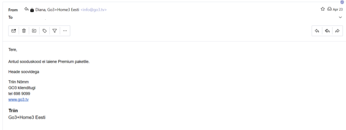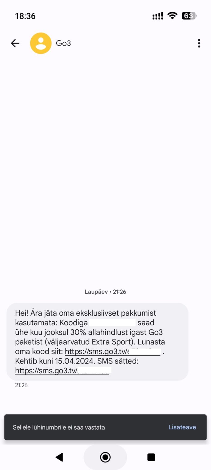 Nimelt oli märtsikuus juhus, kui Go3 saatis mulle SMS-iga sooduskoodi kõikidelt pakettidelt 30%, välja arvatud Extra Sport.